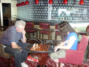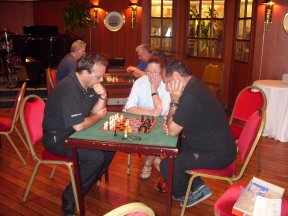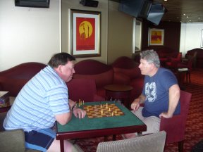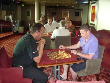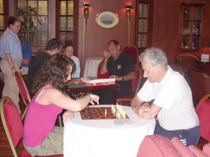 Emma Bentley Chess. Winboard Easy to use FREE PGN File Board Contact Emma Whilst the UK was freezing, Emma was cruising the Caribbean. Starting from Barbados and through the Panama Canal. Emma is currently very busy studying for her science degree ( now complete ) and deserved a couple of weeks in the sun. So, what better than organising a chess get together for P&O on their Caribbean Cruise Liner MV Oceana. P&O - MV Oceana. Cruise Chess Club hosted by Emma. Some very strong players arrived at the Yacht & Compass lounge aboard the Luxury Liner to join in the Chess get together with Emma Bentley. Above :- Emma playing Pete Collins, President of Lichfield Chess Club. Pete is the Captain of the Lichfield first team and with an unbeaten record this season. This was Pete's fourth time on the Oceana and states this cruise was first time Chess had ever been offered on the cruise. Farmer Andrew Morgan from Scotland states it certainly made his cruise more enjoyable. The Chess was organised by Emma with P&O last year and she intends to make it a regular feature. Anyone interested in joining a Chess Cruise next winter please Contact Emma as special rates may be negotiated.