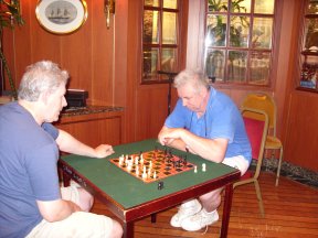 Playing Emma above - Andrew Morgan from Scotland. The Luxury Liners daily entertainment newspaper The Horizon advertised the Chess Get Together with Emma Bentley at 3.30pm on sea days. Three players over 160 grade arrived on the first day and included members of the crew as well as passengers. A Chess Club was immediately formed and a select group of members began a holiday cruise to remember.